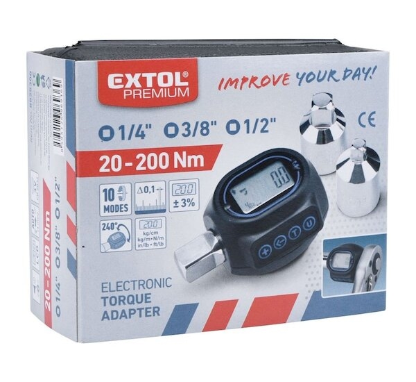Adaptér momentový digitální, 1/2", 20-200Nm, s redukcí na čtyřhran 1/4" a 3/8", EXTOL PREMIUM (8825300)