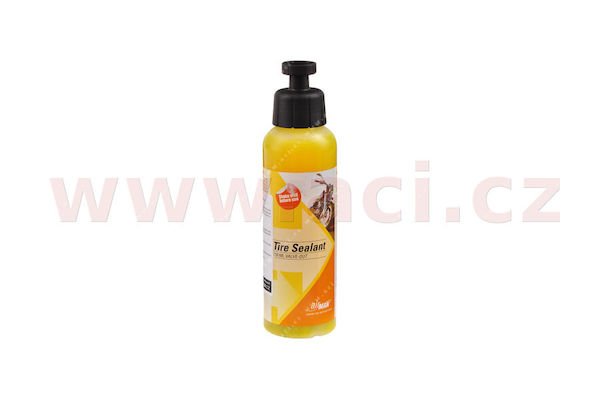 - Protřepejte obsah nádobky před použitím. Natlačte těsnící hmotu do pneumatiky.