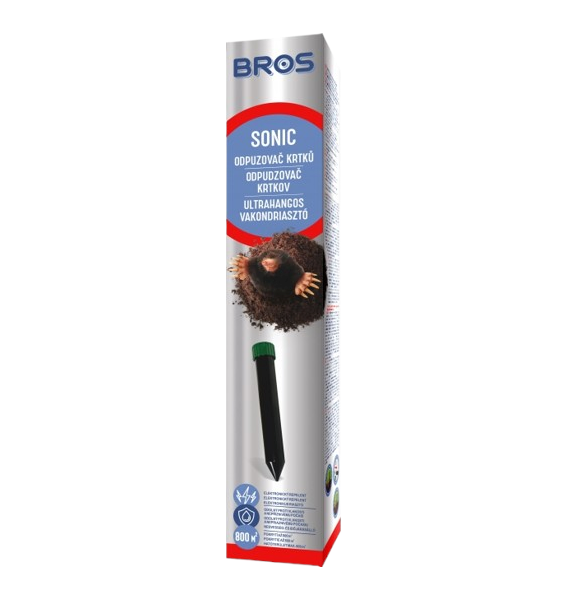 BROS Sonic účinně odpuzuje krtky, hraboše a jiné hlodavce. Je šetrný vůči životnímu prostředí a nevyžaduje použití chemikálií. Zařízení vysílá zvukové signály na frekvenci 400 Hz, čímž odpuzuje krtky a hrabavé hlodavce, kteří mají dokonalý sluch a schopnost cítit vibrace. V závislosti od typu půdy působí na ploše 500 – 600 m2. Těsné balení je účinné mnoho měsíců bez ohledu na roční období a povětrnostní podmínky.