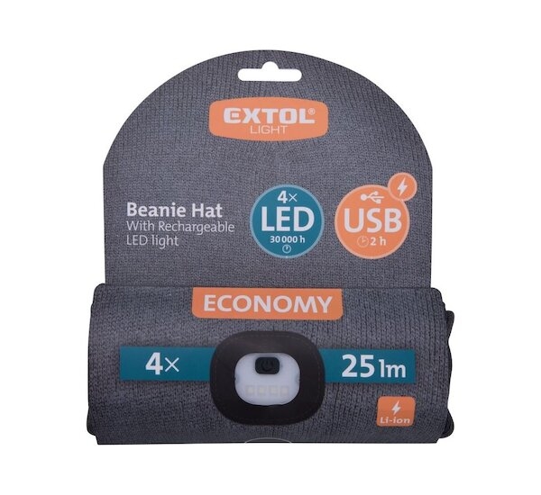 Čepice s čelovkou 4x25lm, nabíjecí, USB, tmavě šedá, ECONOMY, univerzální velikost EXTOL LIGHT