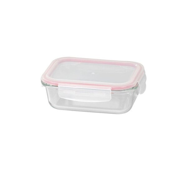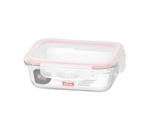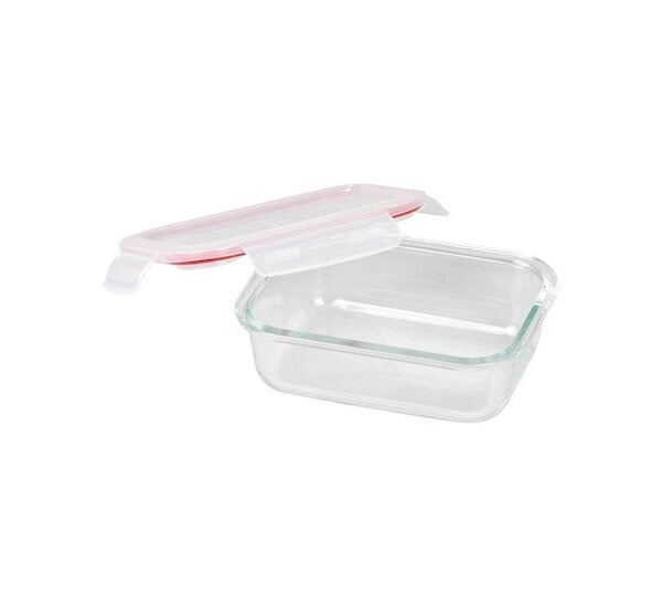 Kompaktní obdélníková skleněná dóza s objemem 650 ml, vybavená plastovým víkem s bezpečným Clip uzávěrem. Ideální řešení pro praktické skladování potravin.