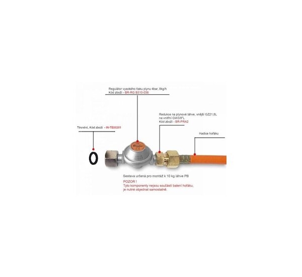 Pro tento typ hořáku doporučujeme zakoupit regulátor vysokého tlaku, redukci a popřípadě jednocestný ventil na 2kg láhev.
