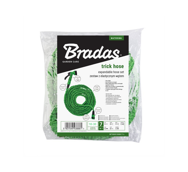Smršťovací hadice TRICK HOSE je oproti ostatním hadicím lehká a díky tomu ušetříte námahu, kterou jste vynaložili při používání běžných, objemných hadic. Tato hadice se roztáhne až na trojnásobek své délky pod tlakem vody (10m bez vody = 30m pod tlakem vody). Snadno ji lze uskladnit. Pod tlakem vody se hadice automaticky natáhne a po vypuštění vody se automaticky vrátí zpět do původní velikosti. Součástí balení je i 7-funkční postřikovač, dvě rychlospojky a připojení kohoutku 1/2" s redukcí 3/4" (možnost napojení na kohoutek atd..).