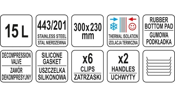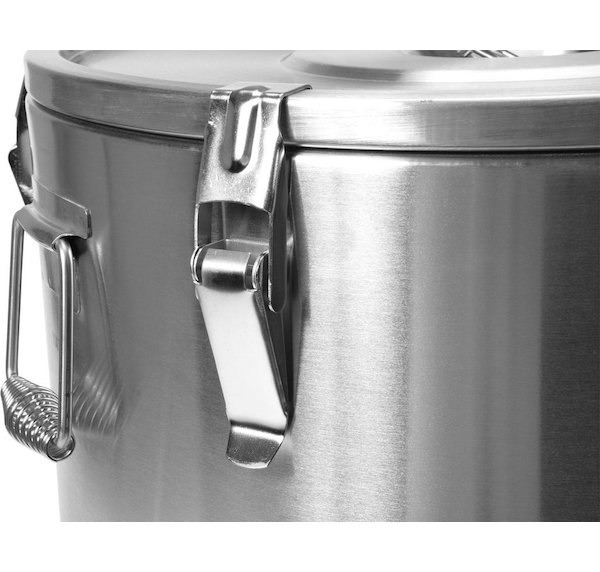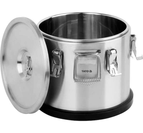Termos je vybaven dvěmi masivními držadly z nerezové oceli pro snadný transport a šesti zápatkami uzavírající víko. Vysoká kvalita a odolnost těchto prvků zaručuje mnoho let bezproblémového používání. Dno termosu YATO je chráněno gumovým krytem, který zabraňuje sklouznutí po zemi během přepravy.