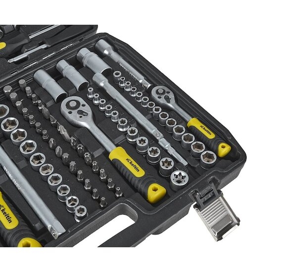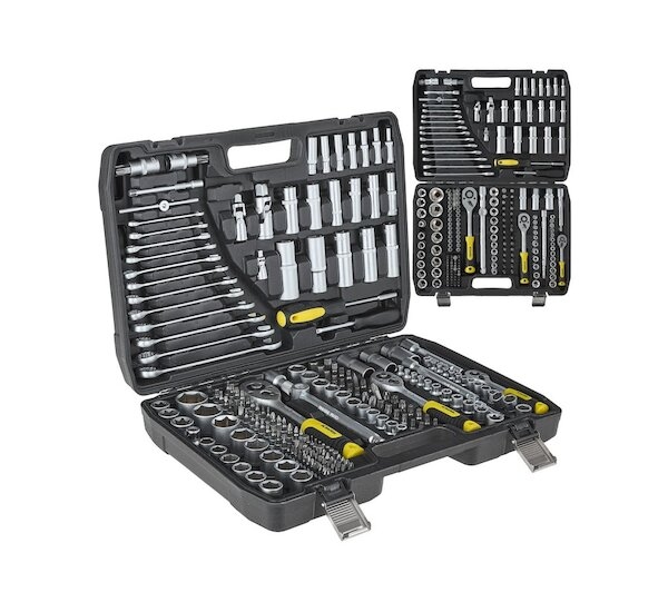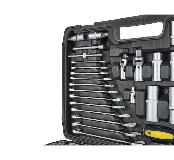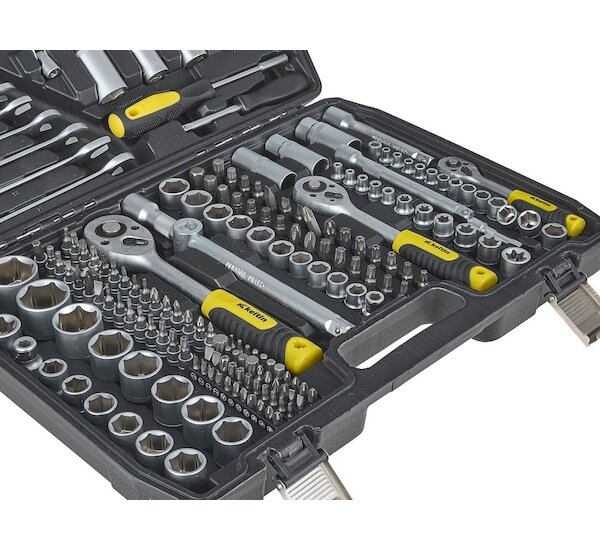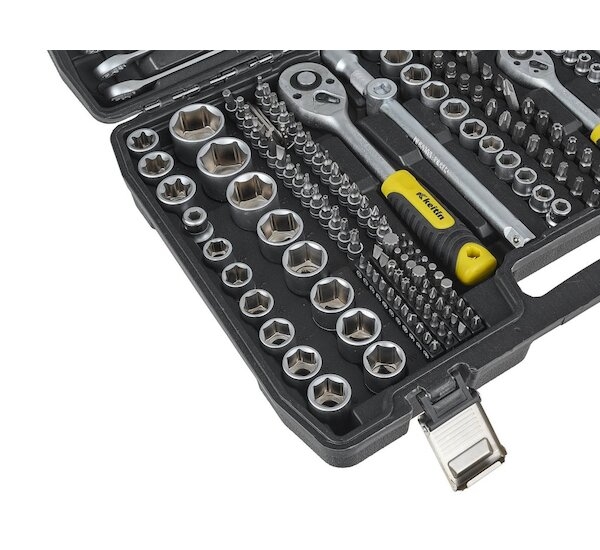 Sada obsahuje nástavce a klíče ve třech velikostech 1/4", 3/8" a 1/2". Tato konfigurace otevírá možnosti pro jakoukoli práci, od jemné údržby elektroniky až po opravy automobilů, motocyklů, lodí či průmyslových strojů. Ideální kombinace hlavic, ráčen, prodlužovacích nástavců a specializovaných bitů umožňuje přizpůsobení každé situaci bez nutnosti sahat po dalším nářadí.