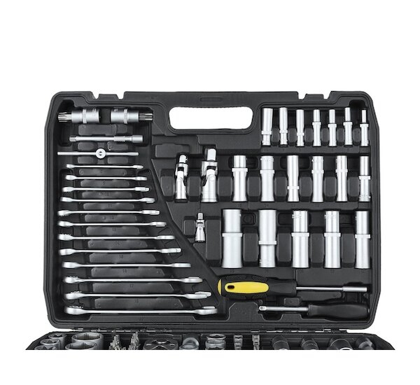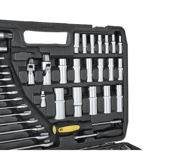 Gola sada K00099 obsahuje 216 ks nářadí a dílů ve velikostech 1/2", 3/8" a 1/4". Kompletní sortiment včetně ráčen, nástrčných hlavic, bitů, kloubů, prodloužení a dalších příslušenství umožňuje široké využití při opravách, údržbě i montážích. Nářadí je vyrobeno z kvalitní chrom-vanadiové oceli, která zajišťuje dlouhou životnost a odolnost proti opotřebení. Přehledné uspořádání v pevném kufru usnadňuje orientaci a přenášení celé sady. Ideální volba pro profesionály i domácí dílny.