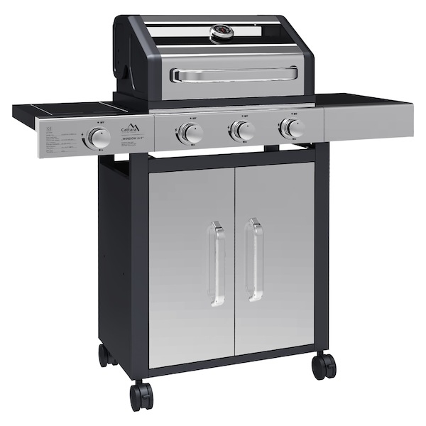 Plynový zahradní gril se systémem Flame Tamer - nevyžaduje lávové kameny. Trojitý hlavní a jeden boční nerezový hořák s piezo zapalováním a plynulou regulací.