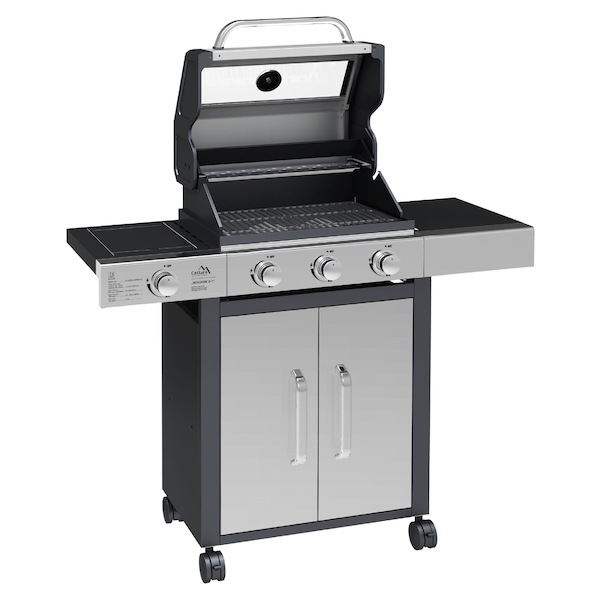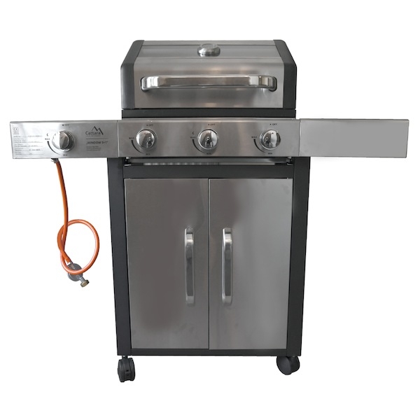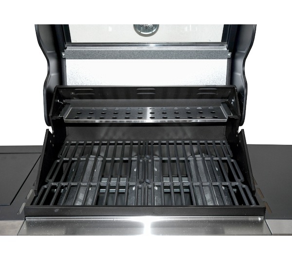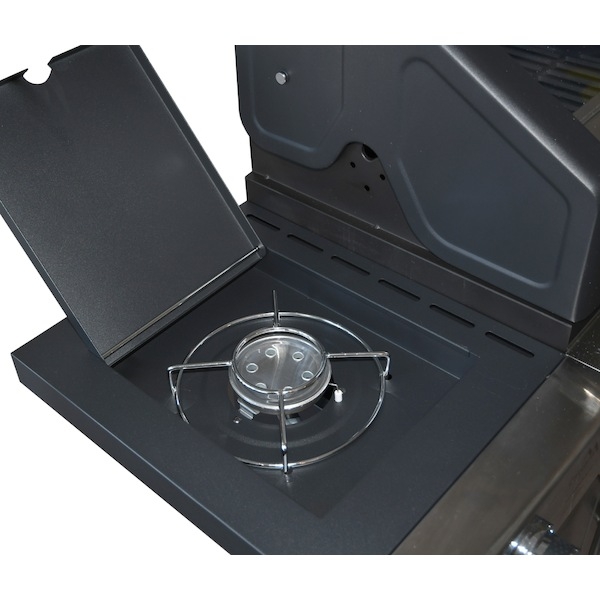 Sklopné víko grilu je opatřeno průzorem, díky kterému je možné sledovat stav grilovaných pokrmů bez otevírání grilu. Gril je vybaven odkládacími poličkami na obou stranách, z nichž jedna je doplněna o boční vařič. Součástí je i spojovací hadice k plynové lahvi a redukční ventil.