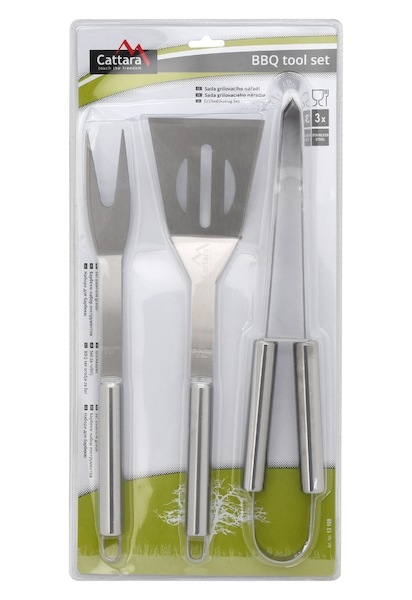 Sada nářadí pro grilování, skládající se z obracečky, vidličky a kleští.