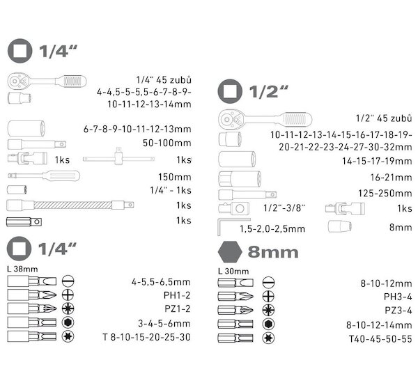 Hlavice nástrčné sada 94ks, CrV, 1/4" a 1/2" EXTOL CRAFT