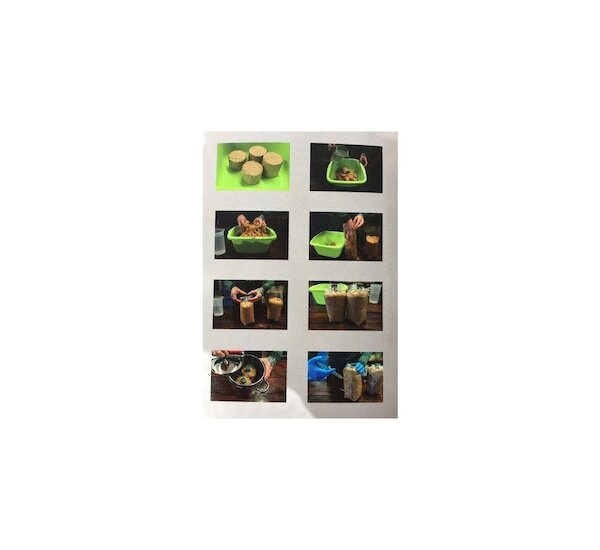 Do misky nebo kbelíku dejte 4 kostky pilin, zalijte je teplou vodou (ne horkou, abyste si nepopálili ruce), cca 1.3 -1.5 l. Po pár sekundách začnou kostky bobtnat a je potřeba je rozdrtit v rukou, abyste získali jednotnou strukturu. Obsah sáčku nasypte do připravených pilin, které obsahují další živiny pro vaše mycelium. Vše důkladně promícháme. Připravený substrát nasypte do dvou fóliových sáčků, které jsou součástí sady. Naplňte sáčky do ¾ jejich objemu, pevně utlačte substrát a poté je uzavřete přiloženým filtračním kroužkem.