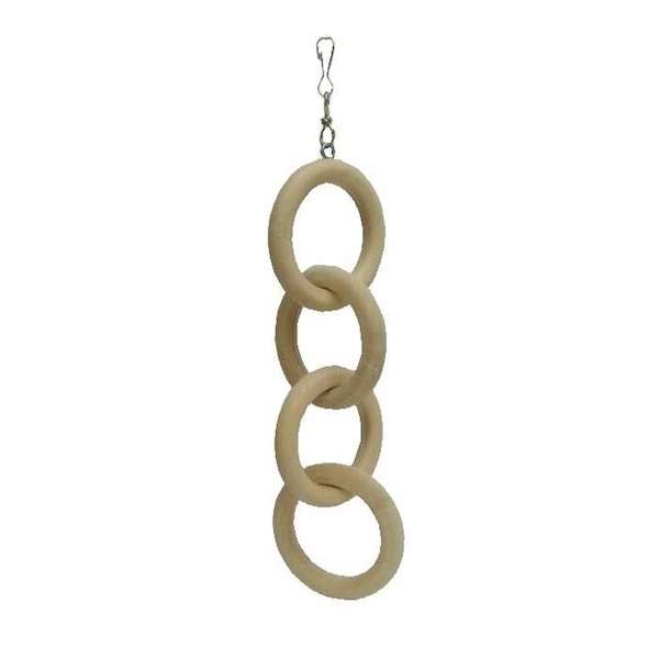 Dřevěné kruhy spojené do řetězu. Síla dřeva je cca 1cm, vnější průměr cca 8cm, hračka vhodná pro střední a velké papoušky, určena k šplhání, zavěšení pomocí karabiny. Díky obrtlíku se přišroubované očko nevytáhne ani když bude papoušek s kruhy točit.