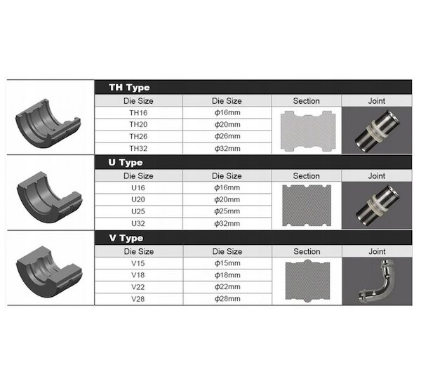 Hydraulické lisovací kleště na lisování hliníkoplastových trubek PEX se sadou vyměnitelných čelistí U / V / TH. Lisovací čelisti se hodí pro většinu běžných systémů. Kleště se vyznačují vysokou kvalitou a opakovatelností lisovaných spojů. Lisy jsou vybaveny otočnou a otevřenou lisovací hlavou se systémem rychlé výměny matric, které umožňují přesnou práci i na těžko dostupných místech. Kleštěj využívají hydraulický válec s upínací silou až 12 tun, což umožňuje přesné a těsné spoje.