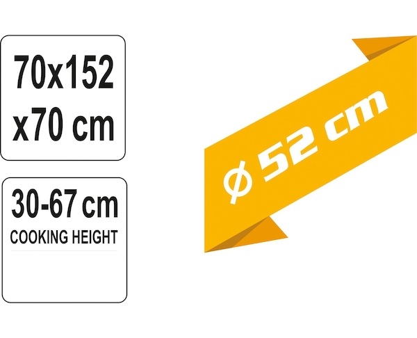 Zhotovení grilu z kvalitní oceli s povrchovou úpravou smaltování. Pro přípravu pokrmů je gril opatřen chromovaným roštem, průměr 49 cm potom zajistí dostatek místa pro jejich přípravu. Rošt lze libovolně výškově nastavit v rozmezí 30 - 67 cm.