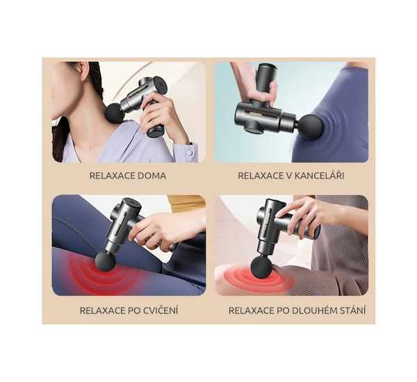 Díky čtyřem úrovním rychlosti lze přizpůsobit intenzitu masáže od velmi jemné až po hlubokou svalovou terapii. Umožňuje tak bezpečné a komfortní použití i pro citlivé uživatele, seniory nebo osoby s drobnější postavou.