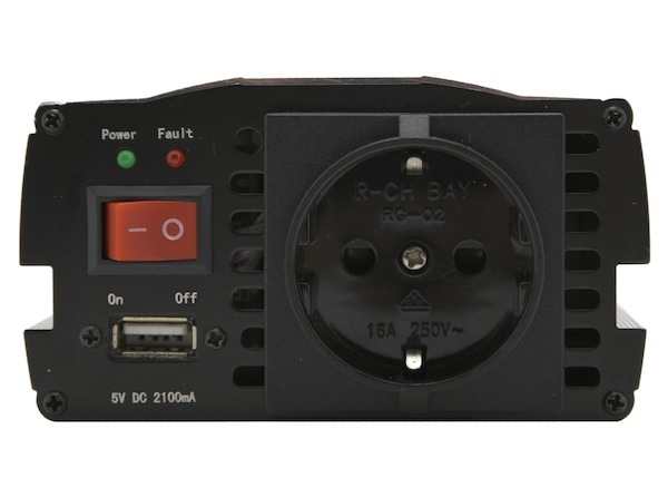 Výstup měniče je osazen běžnou zásuvkou 230V evropského typu pro spotřebiče bez zemnícího kolíku tj "dvoukolíková" zástrčka. Navíc je k dispozici USB zásuvka, vhodná pro MP3 přehrávače, mobilní telefony a další zařízení, která se nabíjejí, či napájejí běžným USB zdrojem 5V až do příkonu 2100mA.