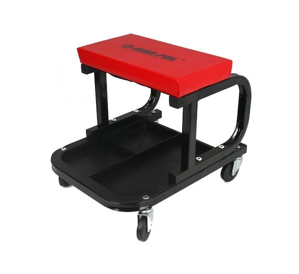 Montážní pojízdná stolička se zesílenou ocelovou konstrukcí, se čtyřmi přepravními kolečky je vybaveno úložným prostorem na nářadí ve spodní části.
