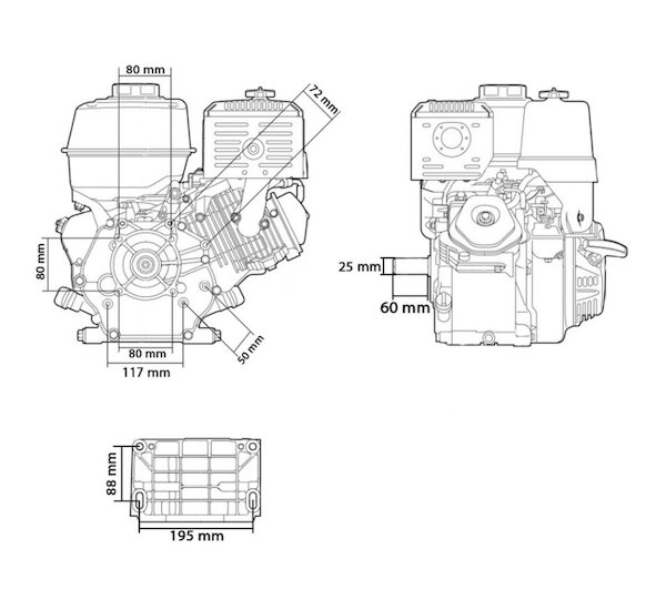 - Orientační rozměry samotného motoru: výška 41, délka 45, šířka 33 cm bez hřídele