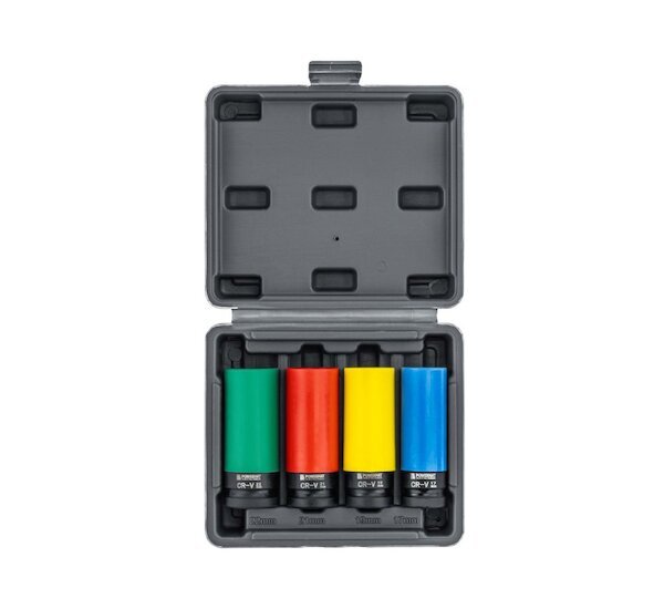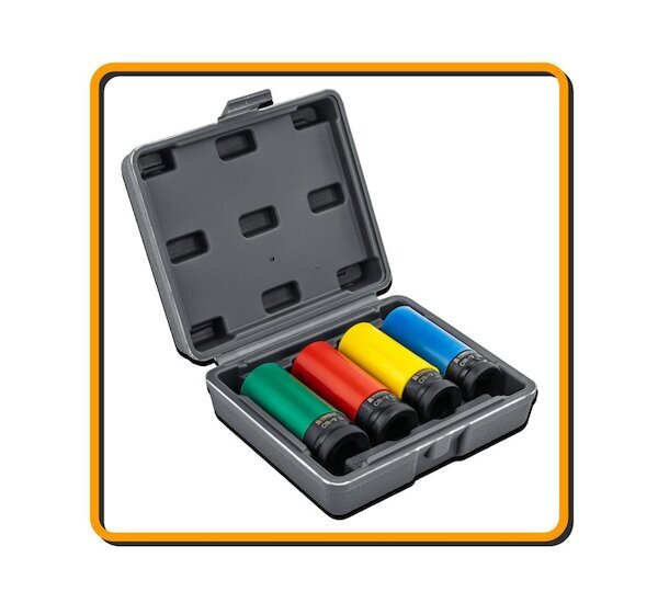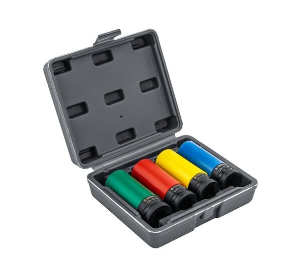 Sada čtyř nástrčných hlavic 1/2" v rozměrech 17, 19, 21 a 22 mm pro bezpečnou práci s hliníkovými disky. Vyrobeno z odolné chrom-vanadiové oceli s ochrannou černou povrchovou úpravou proti korozi. Měkké ochranné návleky chrání lak ráfků před poškozením. Tenkostěnná konstrukce s šestihranným profilem zajišťuje spolehlivý přenos krouticího momentu i v těsných prostorech. Dodáváno v praktickém pouzdře pro snadnou organizaci a transport.