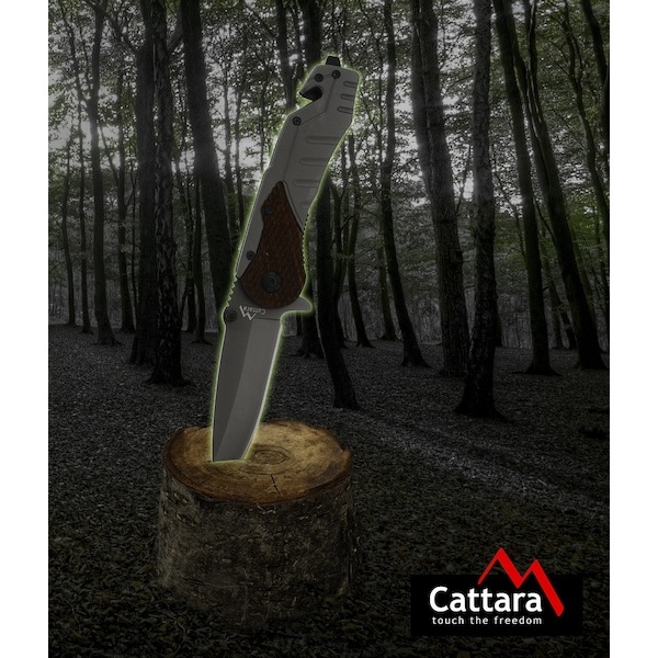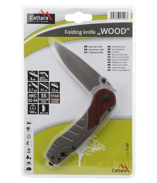 Nůž s titanovým povrchem, s klínem a břitem v zadní části rukojeti. Nůž Wood je užitečný pomocník pro camping, rybaření a další outdoor využití.
