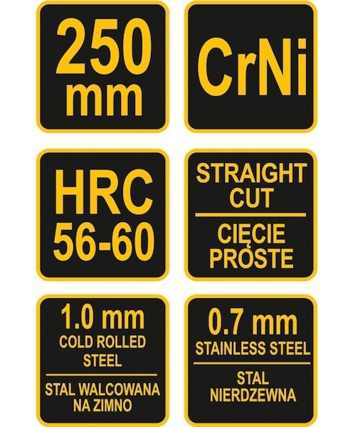 Kvalitní vystřihovací nůžky na plech s čelistmi z chrom niklové slitiny oceli. Tyto vystřihovací nůžky mají břity přizpůsobeny pro přímý střih. Břity mají tzv. mikro ozubení, které zamezuje sesmeknutí plechu mimo osu střihu.