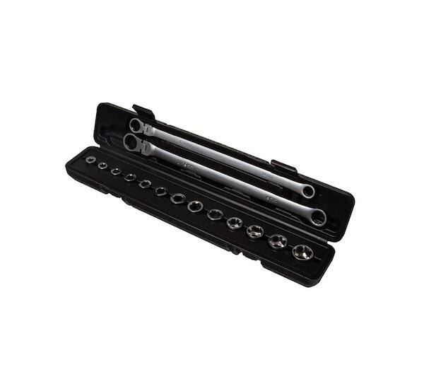 Vysoce odolná sada oboustranných ráčnových očkových klíčů a průchozích hlavic vyrobených z kvalitní chrom-vanadové oceli, ideální pro náročné použití v automobilových dílnách i domácích dílnách. Produkt je vhodný jak pro profesionály, tak i pro kutily, kteří ocení preciznost a spolehlivost nářadí.
