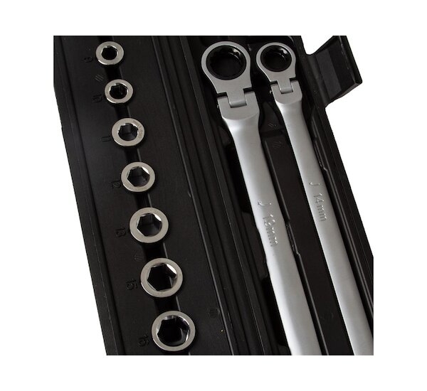 Oboustranné ráčnové očkové klíče s kloubem a průchozí hlavice, sada 15 dílů – MAR-POL