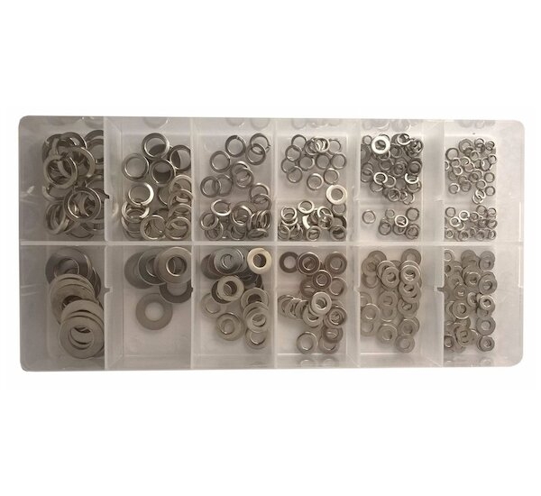 Sada 350ks ocelových podložek umístěná v plastovém boxu s přihrádkami.