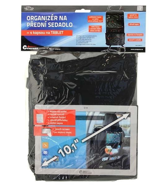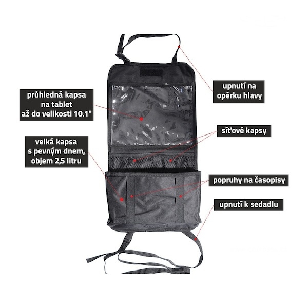 Organizér k připevnění na zadní stranu předního sedadla. Upevnění horní části pomocí popruhů za opěrku hlavy, spodní části popruhy za sedadlo.