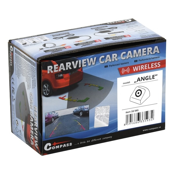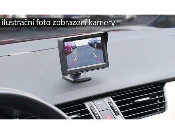 Bezdrátová parkovací kamera s úhlem záběru 120°. Určeno pro montáž na předem určené místo v zadní části vozu.