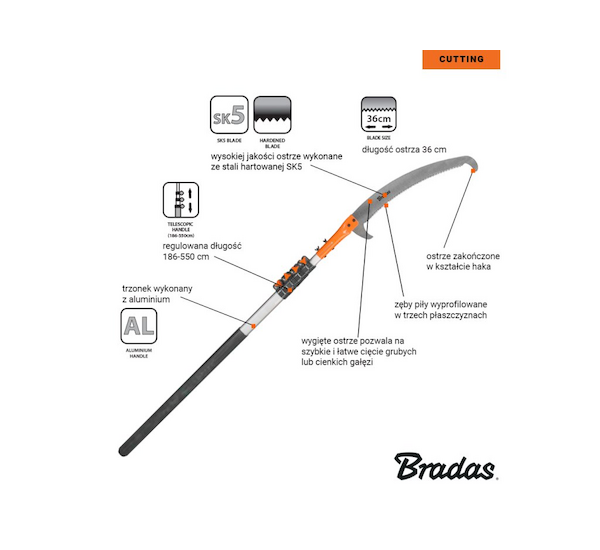 Teleskopická pilka na větve BRADAS V-SERIES-P s čepelí v délce 36 cm a výsuvnou rukojetí nastavitelnou v délce od 186 cm do 550 cm představuje vysoce kvalitní zahradnické nářadí pro profesionální i domácí použití. Zakřivená čepel s háky na obou koncích, ergonomická konstrukce s pokročilým zamykacím systémem zajišťuje bezpečnou a efektivní práci při údržbě stromů a keřů.