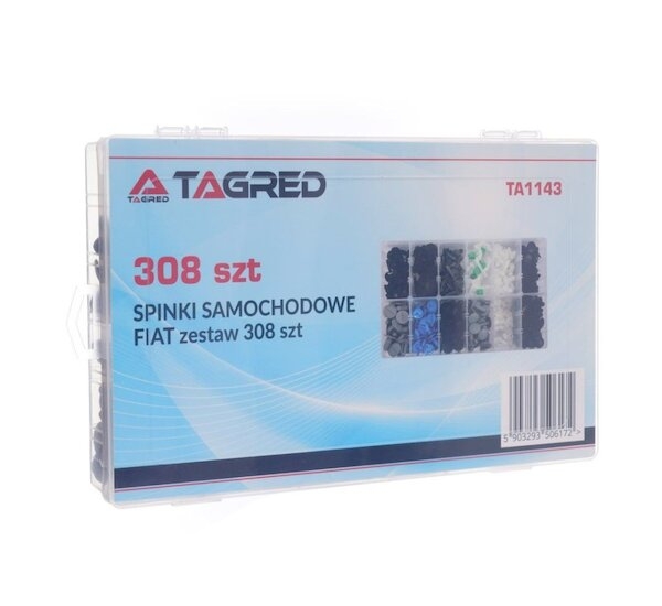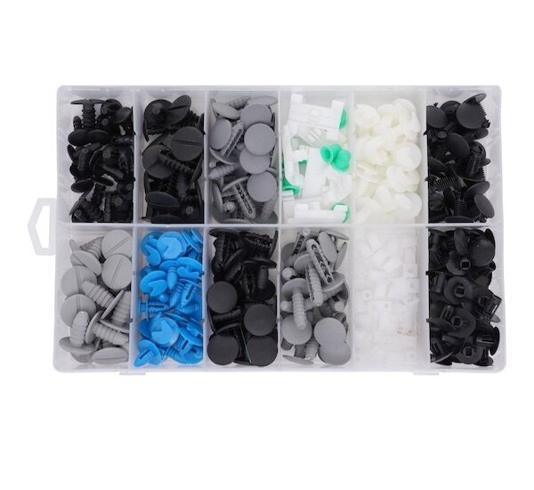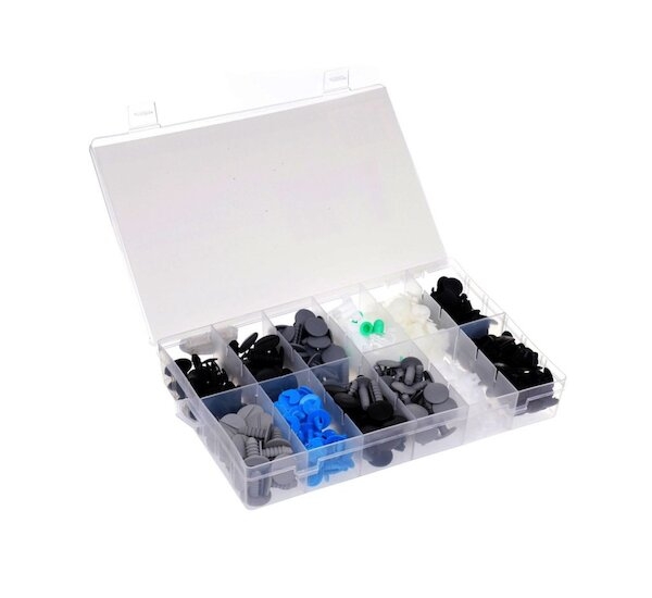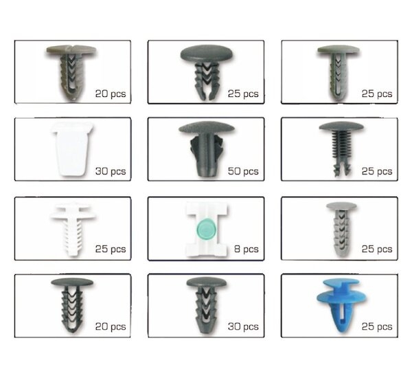 Sada plastových klipů pro vozy Fiat. Balení obsahuje 12 druhů klipů, celkem 308 ks. Vše zabalené v plastovém boxu s praktickými přihrádkami.