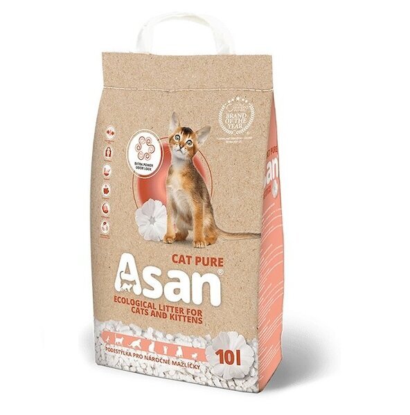 Asan Cat Pure je ekologické stelivo pro krátkosrsté kočky, koťata a fretky s absorpcí 450 % a je na 99 % bezprašná. Neobsahuje patogeny způsobující alergie. Tím je vhodné pro alergiky a astmatiky. Stelivo je v praktickém balení 10 l, přičemž váží pouhých 2,5 kg. Jedno 10 l balení vystačí pro jednu kočku téměř celý měsíc. Stelivo je bez přidané vůně a umělých barviv. Je bezpečný pro zvířata i všechny členy domácnosti. Omezuje růst bakterií a plísní, lze ho skladovat s potravinami. Nezatěžuje životní prostředí. Je vyroben recyklací druhotné suroviny, vznikající při výrobě dámské a dětské hygieny. Při jeho výrobě nejsou káceny stromy ani se netěží z přírody. 100% rozložitelný, lze ho zlikvidovat jednoduše spláchnutím do toalety nebo kompostováním.