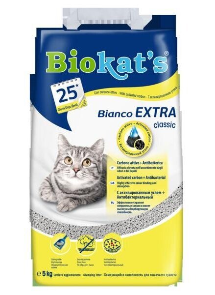 Biokat´s Bianco extra je přírodní hrudkující stelivo bílé barvy. Skvěle hrudkuje a má minimální obsah prachu. Toto stelivo obsahuje také aktivní uhlí, které skvěle neutralizuje zápach. V kombinaci s vysoce kvalitním bentonitem tak patří Bianco extra k jedněm z nejlepších bojovníků proti zápachu z řady Biokat´s. V případě, že vámi zakoupená podestýlka nemá čistě bílou barvu, tak je na vině přírodnina z níž jsou granule vyrobeny. Nejedná se však o závadu.