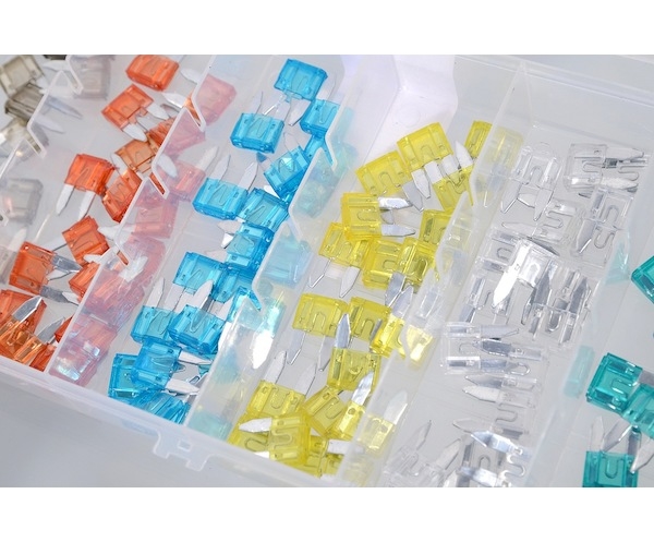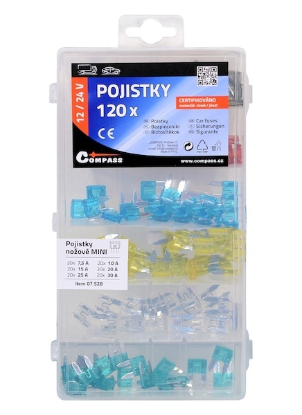 Celkem 120 pojistek v přehledném, přihrádkami opatřeném kufříku. Pojistky jsou určeny pro napětí do 50 V a jsou certifikovány, materiál zinek v kombinaci s plastem.