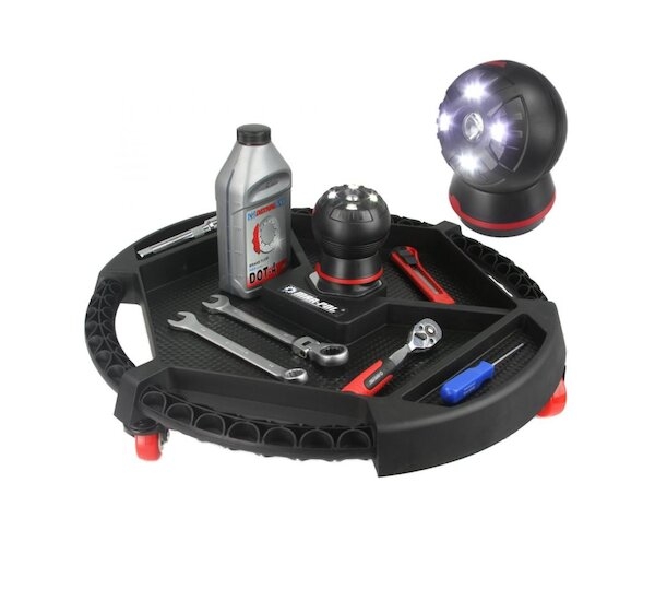 Velmi užitečný prostředek do dílny, garáže, servisu apod. Při práci pod vozidlem nebo v těžce dostupných místech si sebou můžeme vzít potřebná nářadí a příslušenství. Tmavá místa si můžeme přisvítit 360-stupňovou LED lampou s magnetem.