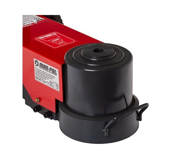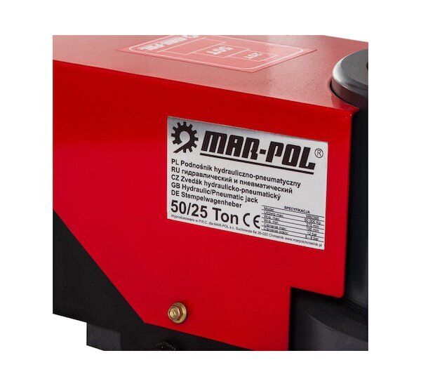 Výkonný pojízdný pneumaticko-hydraulický zvedák MAR-POL s nosností až 50 tun pro nejtěžší nákladní vozidla a stavební stroje. Ovládaný stlačeným vzduchem s pojízdnou konstrukcí na kolečkách a ergonomickou rukojetí. Pracovní rozsah zdvihu 195–370 mm. V balení dva prodlužovací nástavce pro variabilní pracovní výšku. Řešení pro profesionální dílny s těžkou technikou.