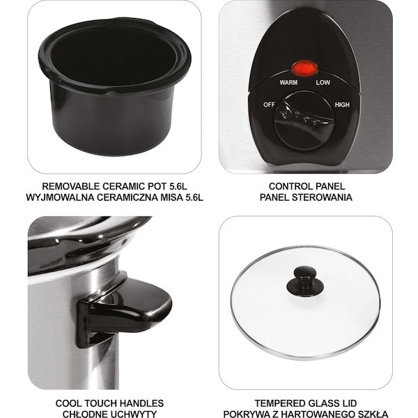 Nepřilnavá keramická mísa pro vaření má objem 5,6l a snadno se čiští. Navíc je opatřena skleněným víkem pro optickou kontrolu pokrmů.
