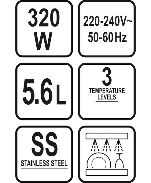 Zařízení je napájeno 1,1 m dlouhým 230V kabelem. Příkon 320W zajistí dlouhodobé vaření při 80-90°C.