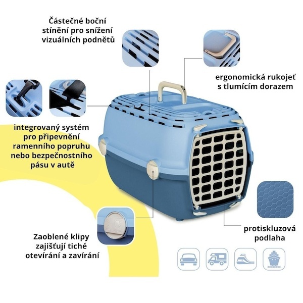 Vhodná pro použití v osobních automobilech, vlacích, lodích, karavanech atd. Praktická a bezpečná přepravka pro malá zvířata.