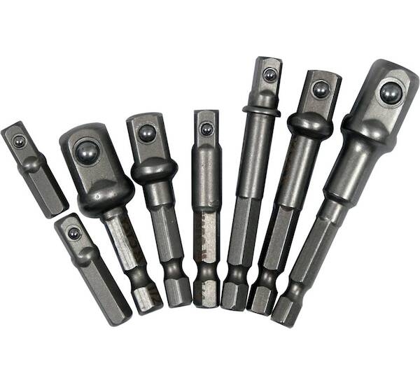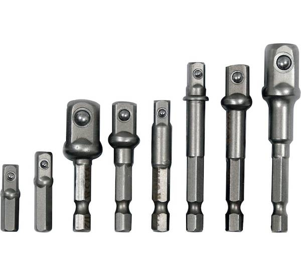 Sada se skládá z 8 adaptérů 1/4", 3/8" a 1/2", každá velikost má různé délky adaptéru 25, 30, 50, 65 a 72 mm.