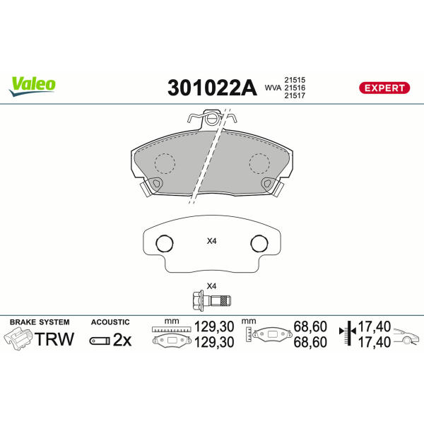 Sada brzdových destiček, kotoučová brzda VALEO 301022A
