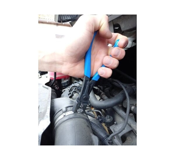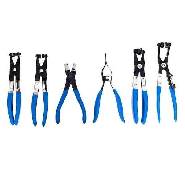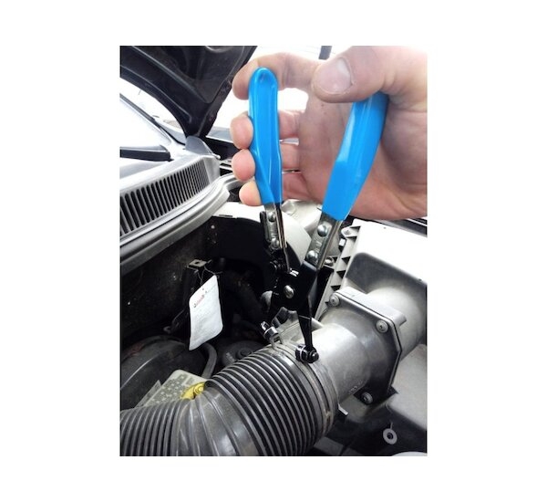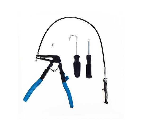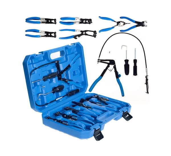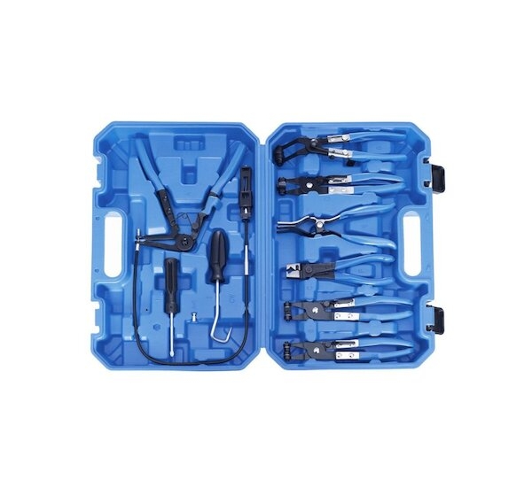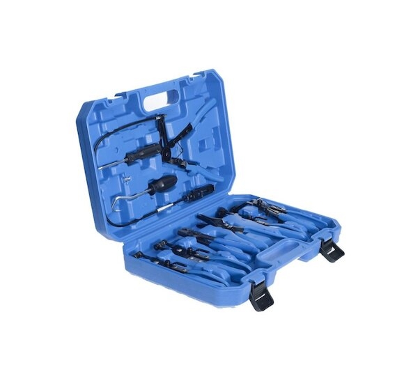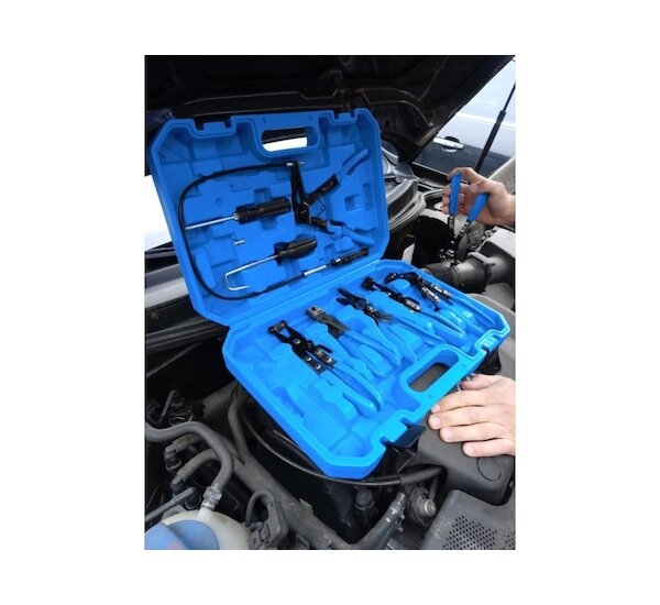 Komplexní sada kleští na hadicové spony v praktickém plastovém kufříku. Sada obsahuje sedm různých kleští na různé druhy samosvorných hadicových spon (pásků), od velkých širokých spon, přes spony typu Clic a Clic-R, až po tenké drátové spony. Součástí této sady kleští jsou speciální kleště s čelistmi na 60 cm bowdenu (lanku) umožňující demontáž hadic ve velmi těžko dostupných místech, což činí tuto sadu velmi flexibilní. Šetří také váš čas, po který by bylo nutné demontovat sousední části, aby se dalo dostat na požadované místo klasickými kleštěmi.