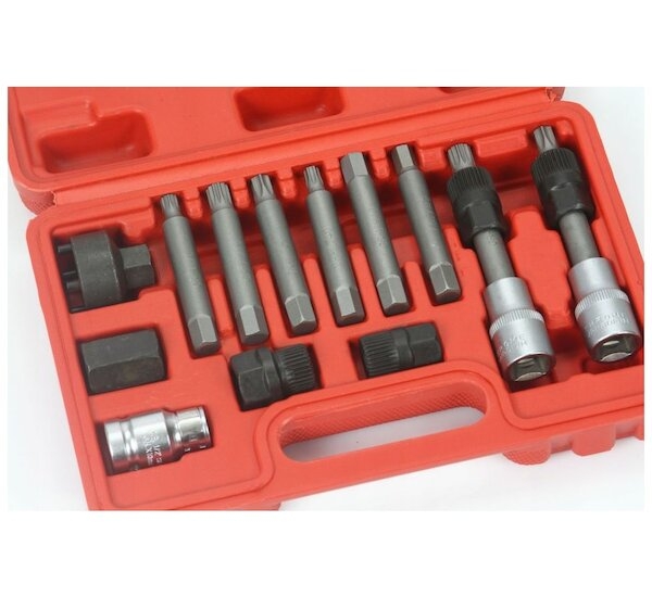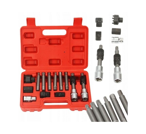 Sada klíčů pro montáž a demontáž alternátorů. Bity jsou vyrobeny z CrV chrom-vanadiové oceli. Klíče umožňují současné vyšroubování upevňovacího šroubu řemenice (pomocí vhodného bitu) a přidržení řemenice se spojkou pomocí speciálního násadky.