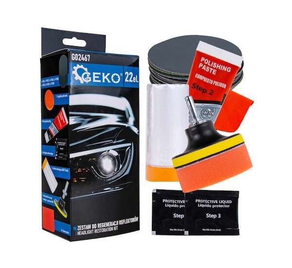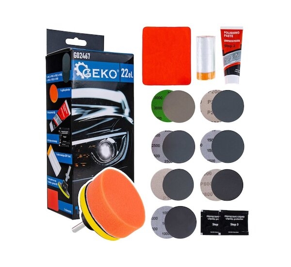 Sada na renovaci předních světlometů GEKO G02467 je ideálním řešením pro každého majitele vozu, který chce obnovit jas a průhlednost světlometů a zároveň odstranit matnost, škrábance nebo zažloutnutí. Díky této praktické 22-dílné sadě lze dosáhnout profesionálních výsledků bez nutnosti návštěvy servisu. Jednoduché použití, všestrannost a dlouhotrvající ochrana světel zajišťují, že vůz bude nejen lépe vypadat, ale také zlepší viditelnost na silnici za tmy.
