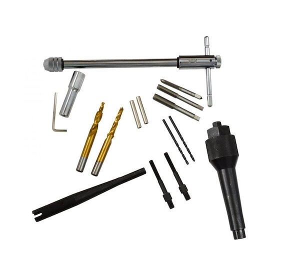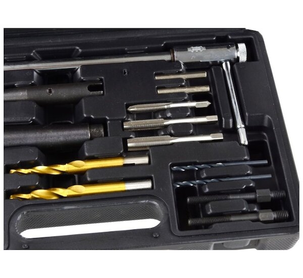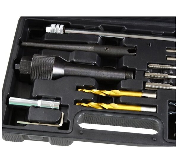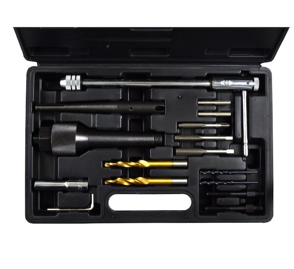 Profesionální sada pro demontáž odstraněných žhavicích svíček a opravu závitu. Sada umožňuje demontáž žhavicích zátek se závity M8 a M10. Opravu lze provádět bez demontáže hlavy - v tomto případě by měl být namontován pneumatický adaptér na místě vhodného vstřikovače. Stlačený vzduch zabraňuje zpracování zbytku do spalovací komory.