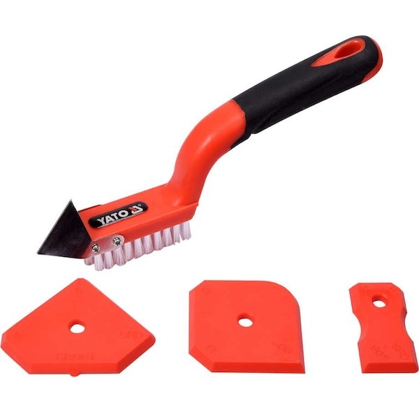 Sada obsahuje tři flexibilní špachtle s profilovanými hranami a rohy, které odpovídají různým šířkám spár, a speciálně navržený kartáč s tvrdými nylonovými štětinami, vhodný k čištění a odstraňování starého materiálu. Kartáč je též vybaven kovovou škrabkou pro hrubší odstraňování tvrdých úlomků materiálu.