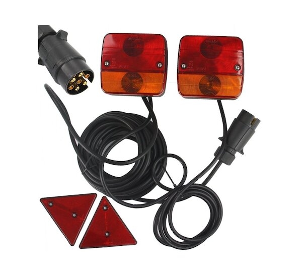 Univerzální sada koncových světel pro přívěsné vozíky, čtyřkolky, traktorky domácí výroby, přívěsy, vlečky atd. Dostatečně dlouhý kabel se standartní zástrčkou (7 kolíků) pro připojení. Uchycení světel pomocí magnetu.