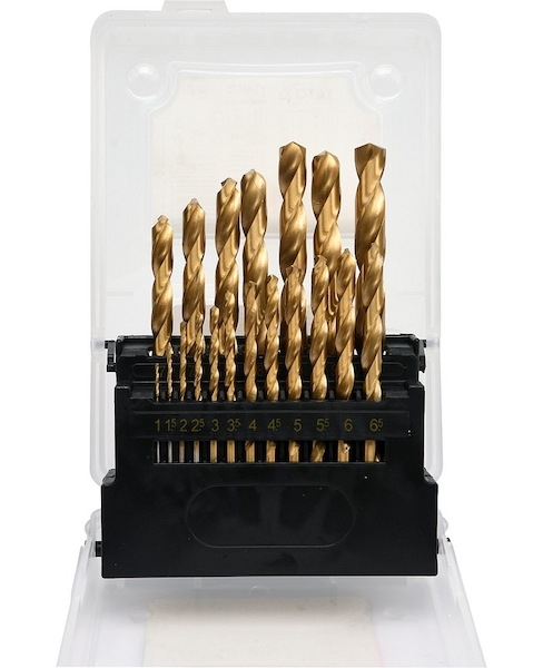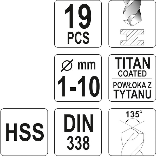 Sada vrtáků s agresivní geometrií břitů. Díky povlaku z nitridu Titanu, vrtáky rychle odvádějí teplo a neztupí se při vrtání u pevných ocelí. Řezný úhel 135° dovoluje vrtání bez nutnosti použití důlčíku. Vrtáky jsou vhodné pro průmyslové použití. Sada se skládá z 19 ks vrtáků od 1 - 10 mm uložených v plastové krabičce. Složení sady 1; 1,5; 2; 2,5; 3; 3,5; 4; 4,5; 5; 5,5; 6; 6,5; 7; 7,5; 8; 8,5; 9; 9,5; 10 mm