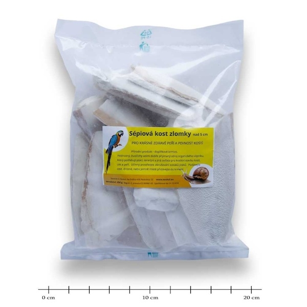 velikost nad 5 cm, 250g v sáčku (velmi výhodná varianta pro „šnekaře, želvaře“ a všechny, kteří nepotřebují celé sépiové kost)